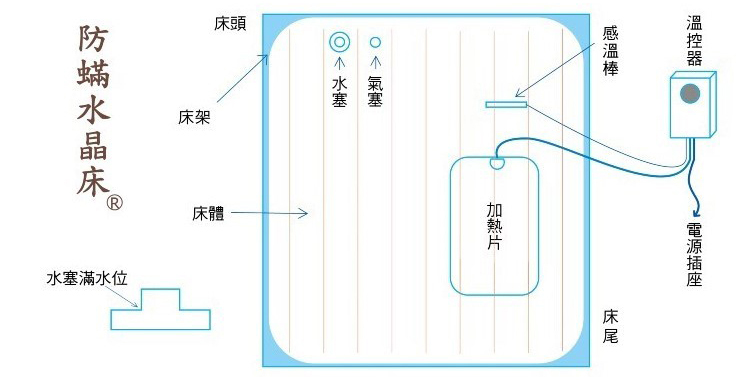 - 防蟎水晶床冬天可調溫助眠、夏天比室溫低4°C,冬暖夏涼穩定睡覺時的溫度,不會失溫就能長壽。建議冬天設定32°C,老人或怕冷體質者夏天設定28°C。床體溫度會慢慢提升,一天達到設定標準。
